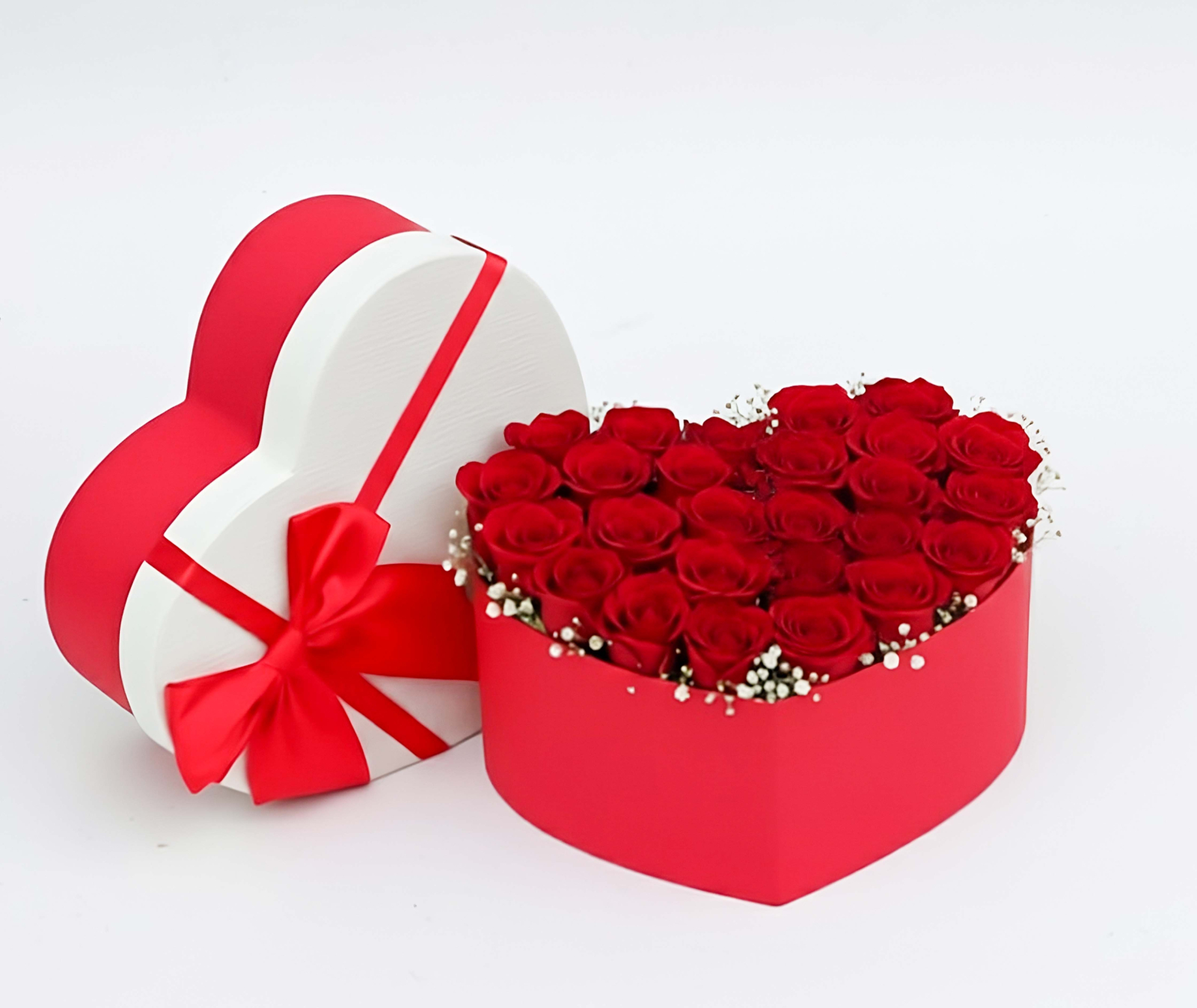 Aranjament Floral – Cutie Inimă, realizat cu trandafiri de săpun, disponibili în trei variante de culoare: roșu, alb sau mix roșu–alb. Cutia este elegantă, în formă de inimă, ideală pentru cadouri romantice, aniversări sau surprize speciale. Trandafirii de săpun sunt decorativi, nu se ofilesc și își păstrează forma timp îndelungat.