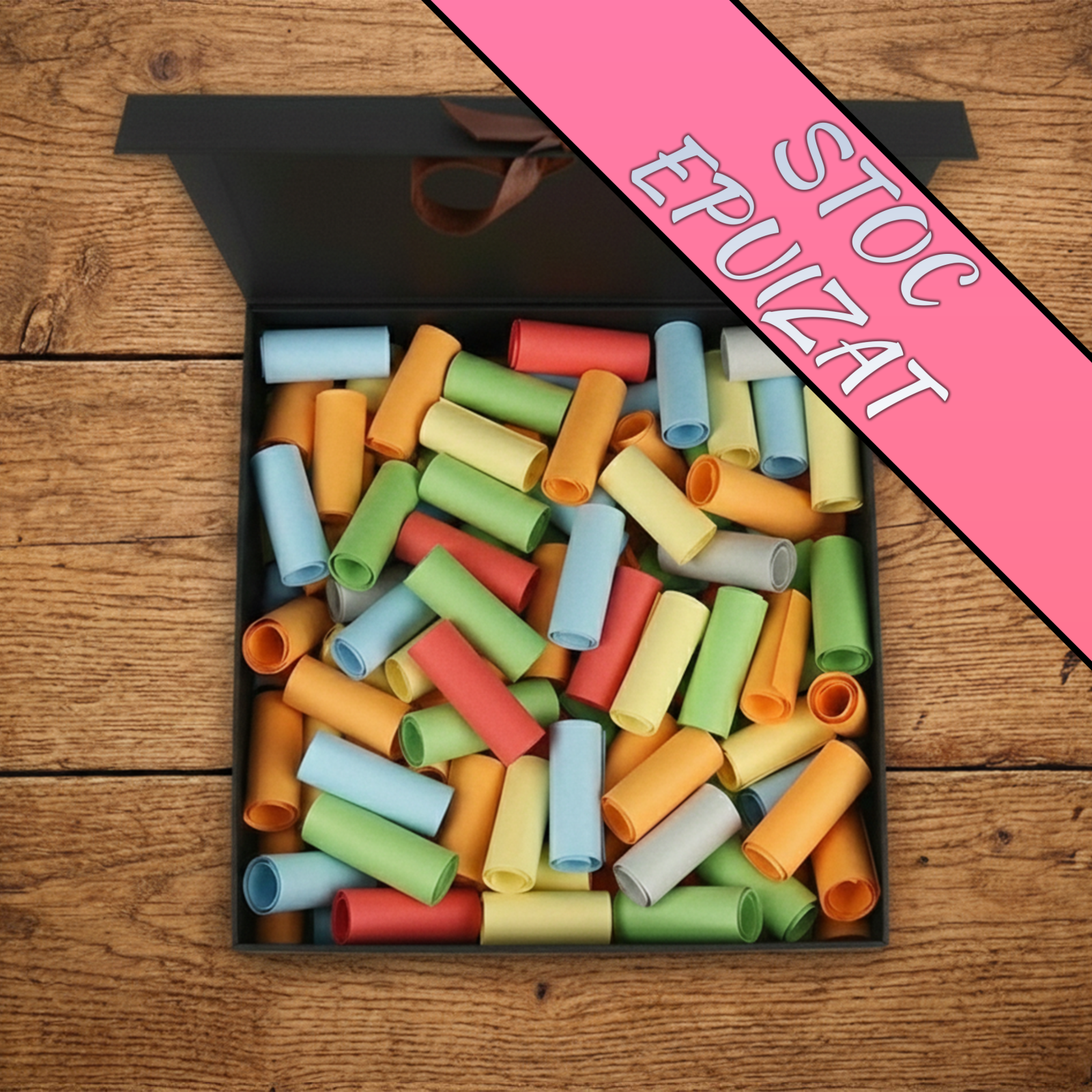 Cutie cadou premium care conține 101 bilețele colorate, fiecare cu un motiv pentru care îți iubești partenerul. Fiecare mesaj este rulat individual, oferind o experiență emoționantă și personală la deschiderea fiecărui bilețel. Ideală pentru aniversări, Valentine’s Day sau orice moment în care vrei să îți exprimi sentimentele într-un mod special.