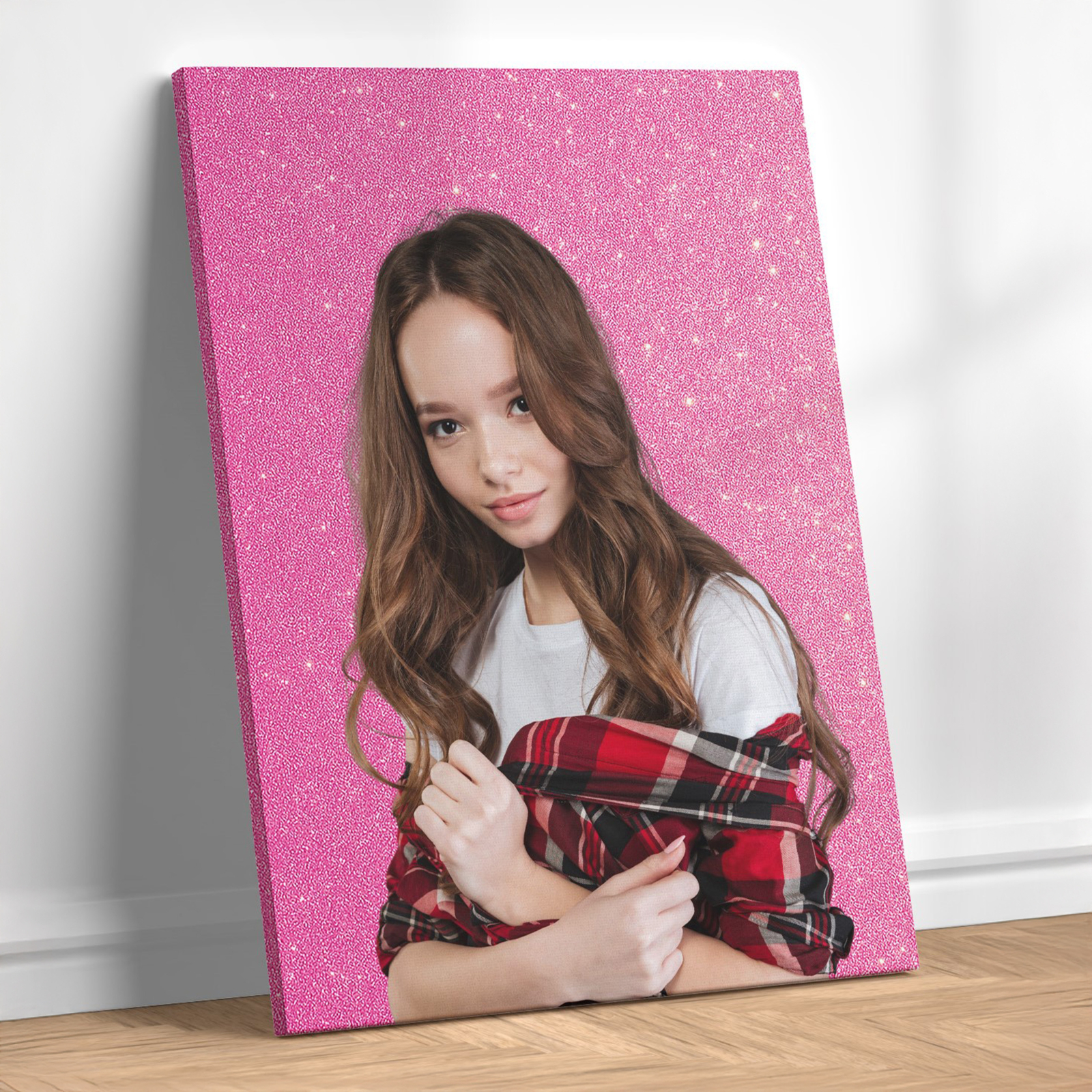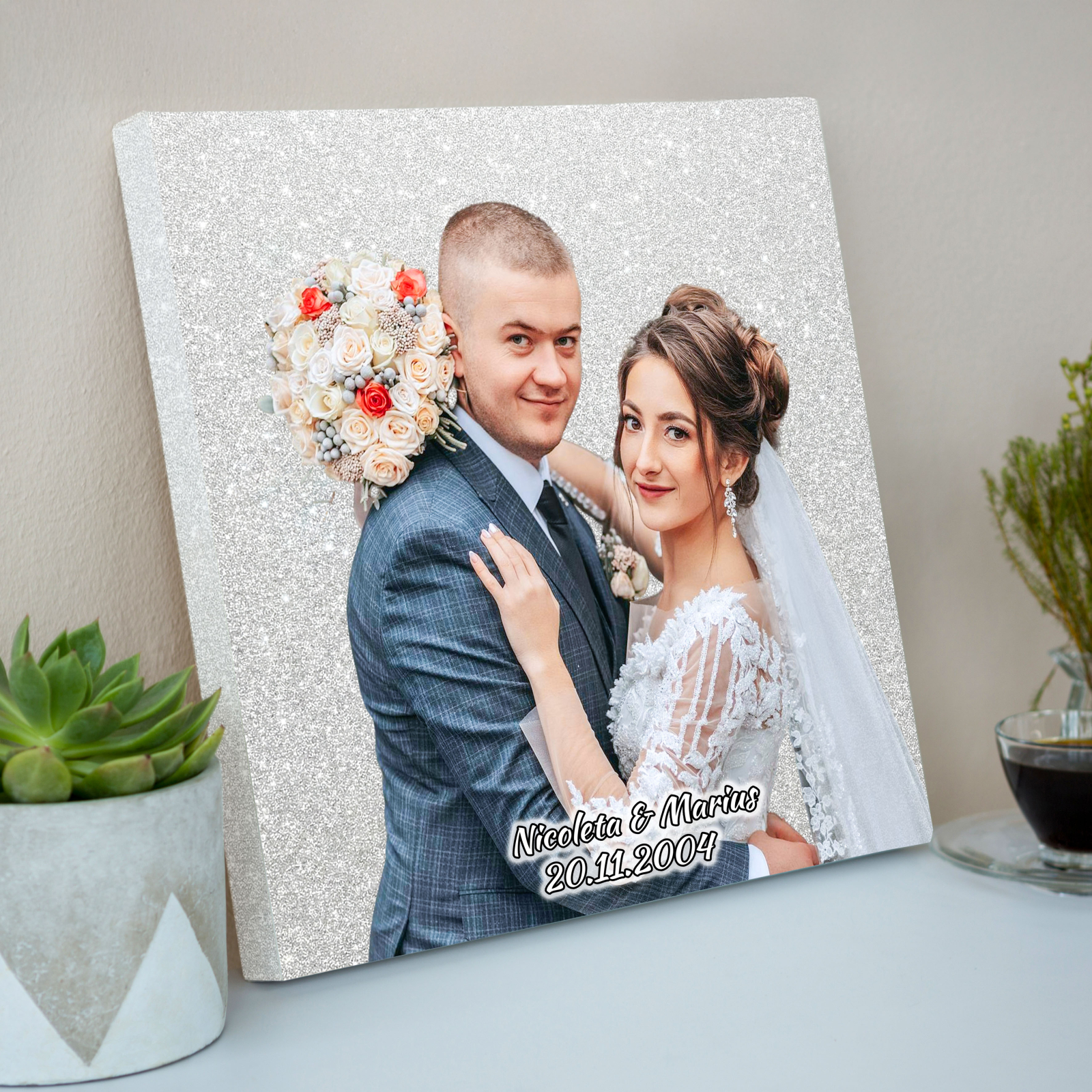 Personalizarea se face prin încărcarea fotografiei, iar imaginea ta este decupată manual de designer, iar pe fundal se aşezată sclipiciul ales, pentru un aspect curat și profesional.